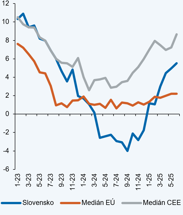 Tržby podnikov pokračovali v raste aj v druhom štvrťroku 2025. Nominálny medziročný rast sa držal blízko 6 %. Z pohľadu tržieb sa výraznejšie darilo podnikom v službách, vo veľkoobchode a v stavebníctve. Spomalenie rastu tržieb nastalo v priemysle, ktorého hlavným ťahúňom bolo spomalenie v automobilovom priemysle. Druhý štvrťrok 2025 poznačila politika prebiehajúcich obchodných vojen, čo sa podpísalo aj na vývoji sentimentu v ekonomike. Indikátor ekonomického sentimentu pokračoval v poklese4. Určitú korekciu negatívneho sentimentu priniesol až august, čo môže byť z časti dôsledkom oznámených obchodných dohôd medzi EÚ a USA.