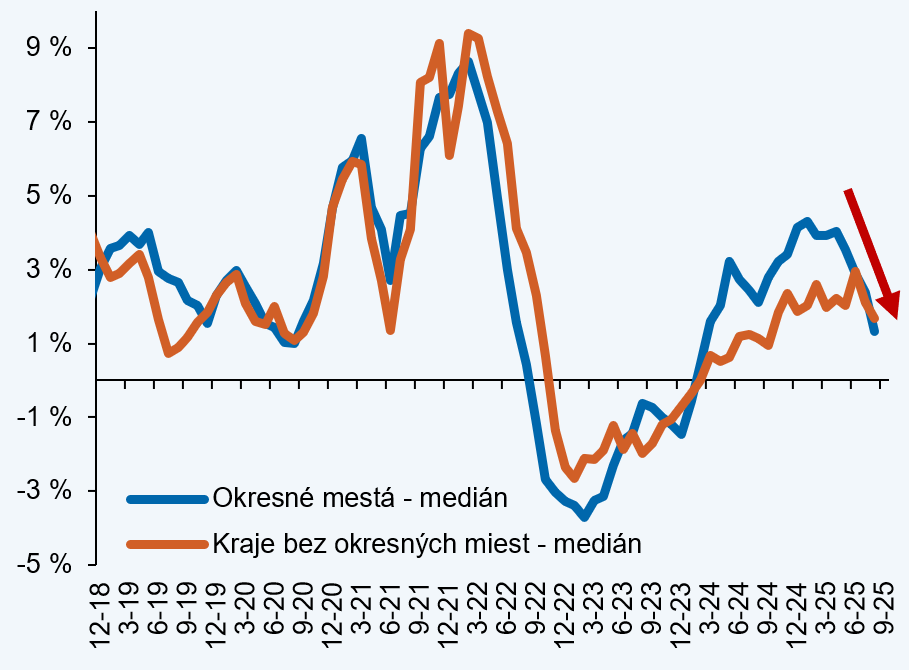 Rast cien bytov bol na úrovni 12 % medziročne, avšak medzimesačne bol pomalší ako na začiatku roka. Spomalenie štvrťročnej dynamiky zaznamenala väčšina krajov aj krajských miest. V auguste 2025 boli medzištvrťročné nárasty cien bytov okolo úrovne 1,5 %.