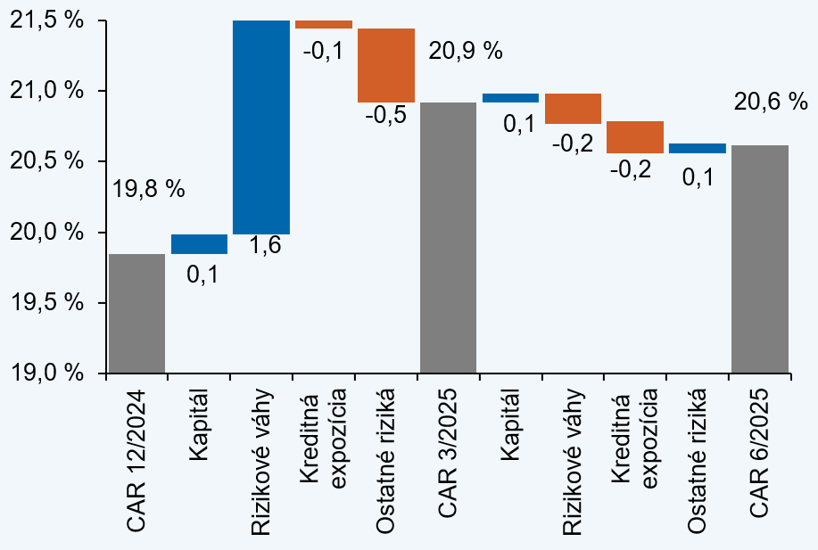Primeranosť kapitálu sa medzi koncom roka 2024 a júnom 2025 skokovo zvýšila, dôvodom bola implementácia bankového balíka CRR3/CRD6.20 Na konsolidovanom základe dosiahla celková kapitálová primeranosť k júnu 2025 úroveň 20,6 %21, a ukazovateľ finančnej páky úroveň 7,97 %.22 Dôvodom nárastu kapitálovej primeranosti bol predovšetkým výrazný pokles rizikovo-vážených aktív spôsobený znížením rizikových váh vybraných tried expozícií pri implementácii upravených kapitálových pravidiel.23