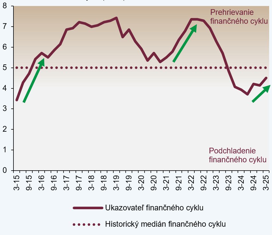Finančný cyklus zrýchľoval aj v druhom štvrťroku 2025. Oživenie cyklu nastúpené pred rokom si zatiaľ udržiava silu. V druhom štvrťroku 2025 k jeho ďalšiemu rastu prispel predovšetkým úverový trh, keď rástli úvery tak podnikom, ako aj sektoru domácností. Po období útlmu sa zároveň mierne zvýšilo zadlženie súkromného sektora. Podiel úverov poskytnutých v ekonomike v roku 2025 mierne vzrástol, pričom sa priblížil k úrovni 60 % HDP, čo je 7 p. b. pod jeho historickým maximom z jesene 2022. Jediným faktorom, ktorý v druhom štvrťroku 2022 spomaľoval rast finančného cyklu, bol oslabený ekonomický sentiment. Celkové zotavovanie finančného cyklu sa síce drží už rok v stabilnom tempe, jeho tempo je však zatiaľ opatrnejšie než pri predchádzajúcich návratoch k rastu.