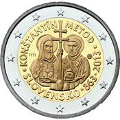The national side of the commemorative euro coin depicts the Thessalonian brothers Constantine and Methodius along with the symbolic double cross stood on three hills. The cross is at the same time held as a Bishop’s crozier, thereby linking together symbols of statehood and Christianity and emphasising the significance of the brothers’ mission, which helped ensure the full sovereignty and legitimacy of Great Moravia – the first Slav state in central Europe. The figure of Constantine is holding a book representing education and faith, while Methodius is shown with a church symbolising faith and institutional Christianity. Along the lower edge of the inner part of the coin is the name of the issuing country “SLOVENSKO”, the year “863” and the year “2013”, with a dividing mark between each. Along the upper edge of the inner part are the names “KONŠTANTÍN” and “METOD”. To the left of the brothers are the stylised letters “mh”, the initials of the coin’s designer Miroslav Hric, and to the right is the mint mark of the Kremnica Mint, comprising the letters “MK” placed between two dies. The coin’s outer ring depicts the 12 stars of the European Union.
