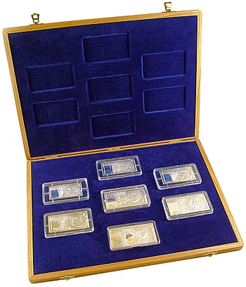| Net weight of precious metals in the set: | 217.7265 g Ag (7 oz Ag) 1.244 g Au (1/25 oz Au) |