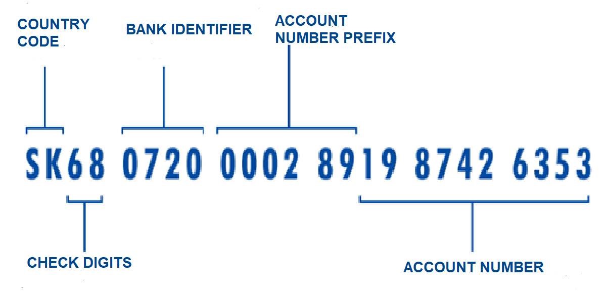 The “Slovak IBAN” is 24 characters long and comprises, from left to right, the following: the country code “SK”; two check digits; the four-digit bank identifier (for example, 0720, the identifier of NBS); six digits comprising zeros or the account number prefix (not longer than six digits and preceded by one or more zeros if shorter than six digits); and ten digits comprising one or more zeros plus the account number, or a ten-digit account number.