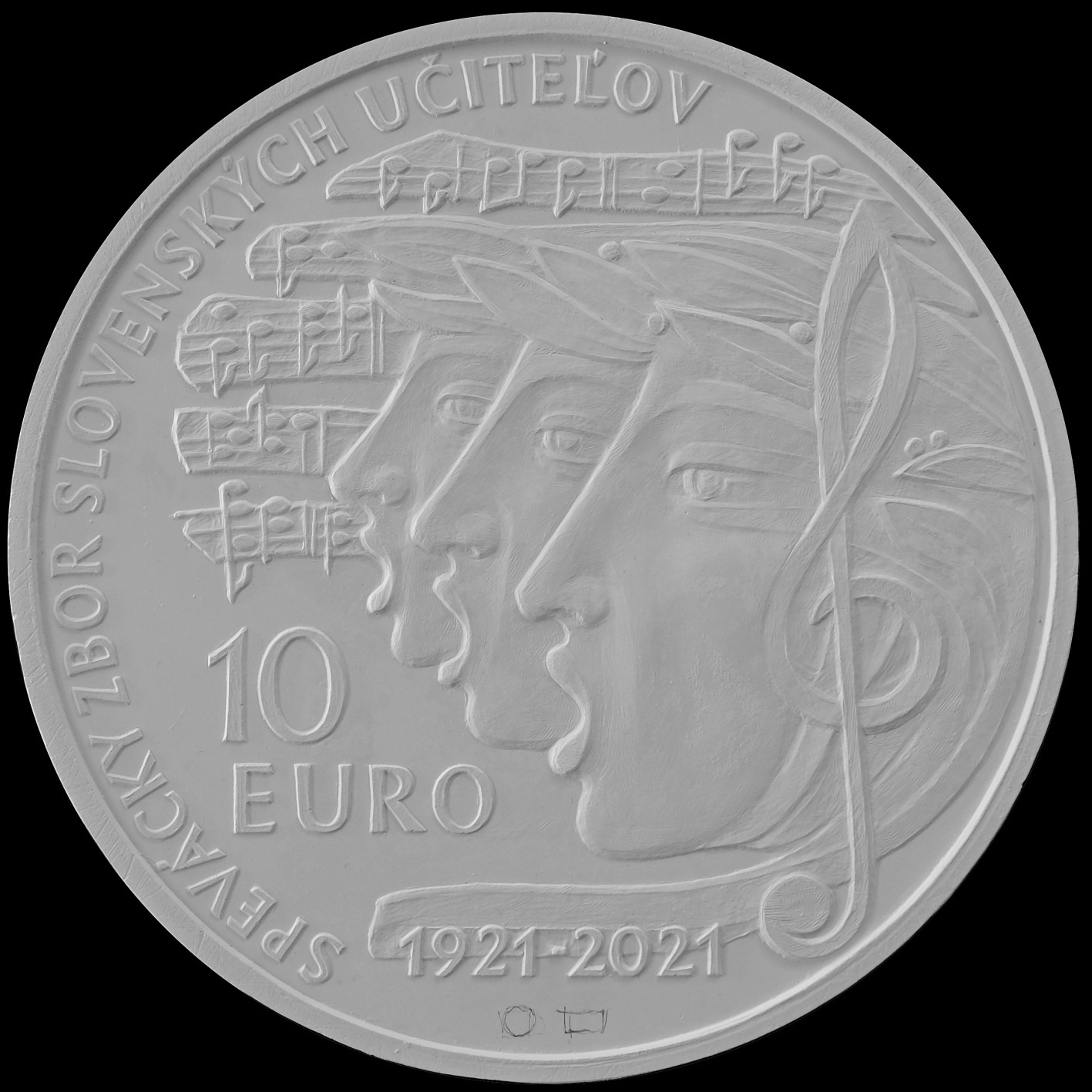 Odborná komisia odporučila prvú cenu a realizáciu výtvarnému návrhu autora ak. soch. Zbyňka Fojtů. Na averze uplatnil autor výrazné horizontálne členenie plastických motívov na tri celky. V hornom je v strede v najvyššom bode štátny znak a pod ním je vložený nápis SLOVENSKO. Výplň tvorí pravidelná linajková štruktúra. Strednému celku dominuje ženský profil s rozviatymi vlasmi, ktoré na seba preberajú symboliku šírenia zvukových vĺn. Motív je odvodený od predlohy iného autora (akad. soch. Mariána Polonského) a dodnes sa používa ako oficiálny členský odznak SZSU, aj ako jeho logo. Autor súhlasí s prepisom jeho diela na euromincu, zároveň však požaduje uvádzať pri opise euromince jeho autorstvo loga SZSU a doplniť na výtvarnom návrhu v logu jeho iniciály „MP“. V dolnom celku je umiestnený letopočet 2021 a zjednodušená silueta trenčianskeho hradu, pod ním je označenie nominálu 10 EURO. Reverz mincového poľa opäť zdôrazňuje výrazný kompozičný rytmus horizontálnych „riadkov“. V hornej časti je umiestnená štylizovaná lýra symetricky obložená letopočtami 1921 a 2021. Nasleduje notový zápis, ktorý predstavuje nápev slovenskej štátnej hymny. Jednotlivé noty autor vtipne prekonvertoval na písmenká klávesnice písacieho stroja, ktoré vytvárajú text SPEVÁCKY ZBOR SLOVENSKÝCH UČITEĽOV.