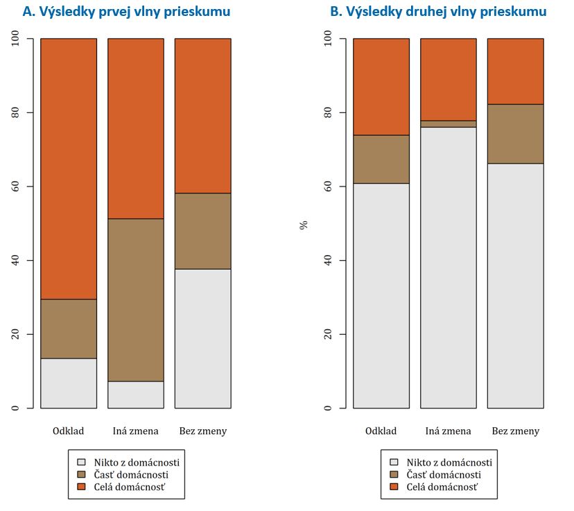 Poznámka: Odklad = domácnosti, ktoré požiadali o odklad splátok; Iná zmena = domácnosti, ktoré si vybavili inú zmenu úverových podmienok kvôli kríze; Bez odkladu = domácnosti, ktoré o odklad splátok nepožiadali. Nikto z domácnosti = žiadnemu členovi domácnosti sa nezhoršila príjmová situácia; Časť domácnosti = buď sa zhoršila príjmová situácia hlavnému dlžníkovi alebo jeho partnerovi; Celá domácnosť = Hlavnému dlžníkovi a aj jeho partnerovi (ak má) sa zhoršila príjmová situácia.