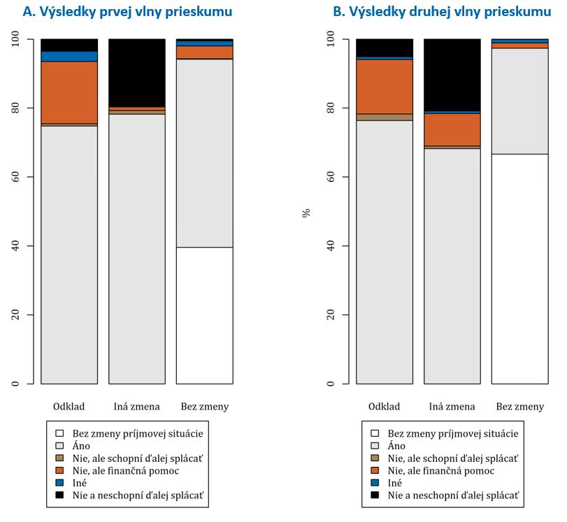 Poznámka: Bez zmeny príjmovej situácie = domácnosti, ktorým sa príjem nezmenil; Áno = domácnosti, ktoré očakávajú, že sa po skončení koronakrízy vrátia na pôvodnú úroveň príjmu; Nie, ale finančná pomoc = domácnosti, ktoré neočakávajú návrat na pôvodnú úroveň príjmu, budú si však môcť peniaze požičať od rodiny alebo známych; Nie, ale schopní ďalej splácať = domácnosti, ktoré neočakávajú návrat na pôvodnú úroveň príjmu, ale budú schopné ďalej plniť svoje finančné záväzky; Nie a neschopní ďalej splácať = domácnosti, ktoré neočakávajú návrat na pôvodnú úroveň príjmu a zároveň nebudú schopné ďalej plniť svoje finančné záväzky.