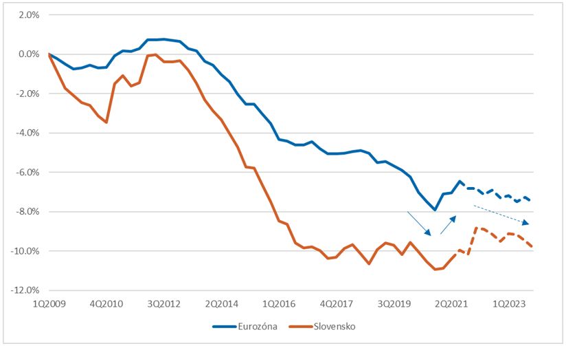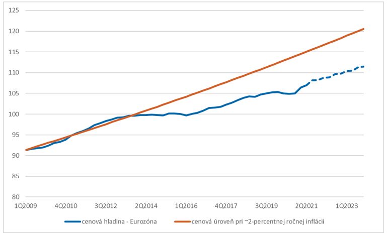 Graf 2: Cenová úroveň v eurozóne a na Slovensku – odklon od trendu želaného v minulosti