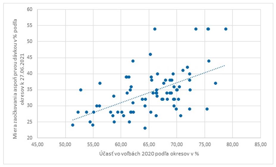 Vzťah medzi dôverou či nedôverou obyvateľstva vo verejné inštitúcie a ochotou sa zaočkovať však možno vidieť aj v rámci samotného Slovenska. Ako možno vidieť na grafe č. 4, zaočkovanosť v regiónoch na Slovensku s nízkou volebnou účasťou v parlamentných voľbách 2020 je v priemere nižšia ako v regiónoch s vyššou účasťou. Ak považujeme volebnú účasť za indikátor dôvery ľudí v štátne inštitúcie, ich politickú a verejnú zaangažovanosť, tak sa nízka dôvera vo verejné inštitúcie prejavuje jasne v nižšej miere zaočkovania.