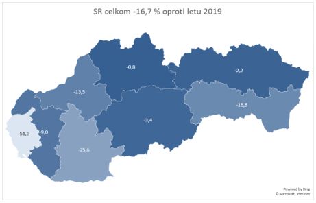 Hotelierov na severe Slovenska podržali domáci turisti, juhozápad sa v návštevnosti výrazne prepadol. Tatry, Liptov a okolie zaostávajú v návštevnosti za letom 2019 len mierne. Pokiaľ však ide o zahraničných turistov, až tretina z nich si pred pandémiou volila ako svoju dovolenkovú destináciu hlavné mesto a okolie. Preto sa s nástupom pandémie počet turistov v Bratislavskom kraji prepadol najviac a to až o polovicu.