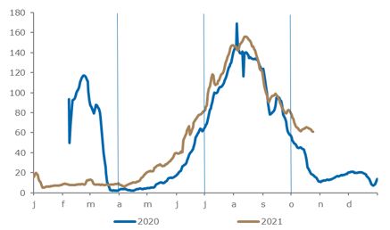Situáciu v ubytovaní podobnú minulému roku potvrdzujú aj tržby, keď príjmy v tomto odvetví vzrástli len veľmi mierne oproti letu 2020. Letné mesiace sú zvyčajne spojené s nízkou chorobnosťou. S príchodom jesene a sychravejšieho počasia sa aj zdravotná situácia zhoršuje. Napriek zhoršovaniu pandemickej situácie sú príjmy hotelierov v októbri vyššie ako pred rokom. Na jednej strane to súvisí s regionálnym covid-automatom, vďaka ktorému nie sú potrebné celoplošné opatrenia, na druhej strane je zrejme dôvodom aj menšia opatrnosť obyvateľstva, či už zaočkovaného alebo nie. Rovnako to vidieť aj vo vyššej mobilite ľudí ako počas minulej jesene.